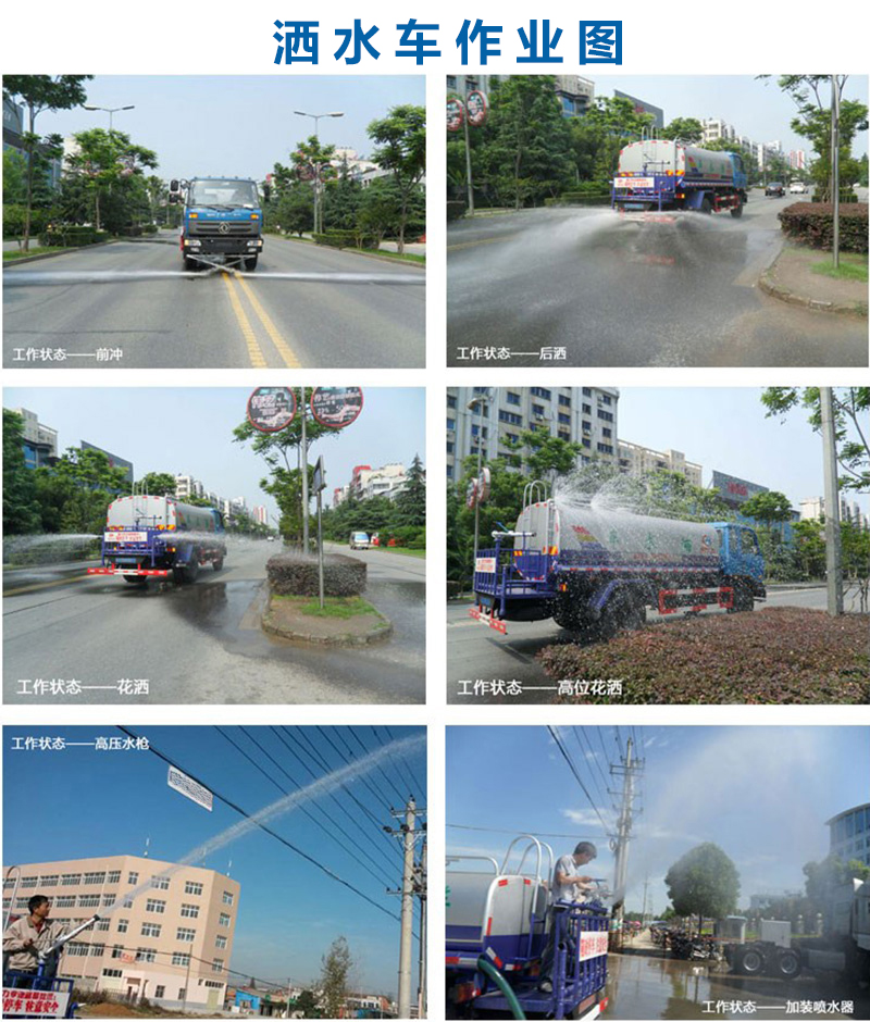 隨底盤選裝駕駛室;選裝側噴及農藥炮;品名:水;密度:1000千克/立方米;有效容積:15.6立方米;罐體外形尺寸(長×長軸×短軸)(mm):6600×2300×1500;ABS吸程≧7米,灑水寬度≧14-16米,射程25-30米,引水時間<5min,流量60m3/h。前沖()、后灑、帶側噴(花灑)、帶后工作平臺、平臺上安裝綠化灑水高炮(炮噴射形狀可調節:直沖、大雨、中雨、毛毛雨、霧狀、可連續調節,360°旋轉),配消防接口,自流閥,濾網,帶自吸自排功能。配備大功率專用灑水泵,泵可自吸自排,安裝過濾網,帶消防接口,可通過消防栓進水,帶自流閥,隨車選裝20米綠化卷盤,可噴灑農藥,罐體金屬漆。罐體有橢圓和方圓罐兩種,可根據用戶的要求定做。