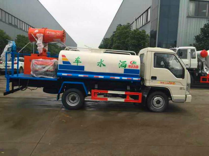 灑水車有自吸功能(從池塘吸水,垂直吸深10米)。配兩個前沖灑水頭(灑水寬度15米),后面4個灑水噴頭(可向后面和側面灑水),后工作平臺及灑水高炮(高炮射程可達30多米,可做應及消防使用)。兩根吸水管(池塘吸水用),水位顯示計。