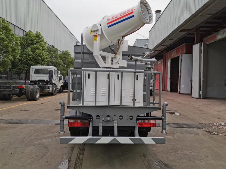 東風5噸灑水抑塵車云內95匹馬力發動機  5檔變速箱,700-16輪胎罐體采用武鋼優質鋼材制作,專用功能為:前沖后灑,帶側噴,罐體后帶工作平臺,平臺上安裝綠化灑水高炮,帶專用灑水車水泵,帶自流閥,帶消防接頭,加裝30型霧炮,帶8千瓦柴油發電機組,霧炮可以遙控操作