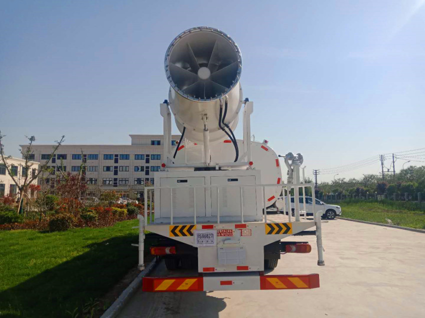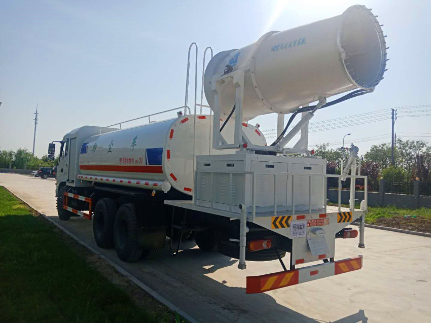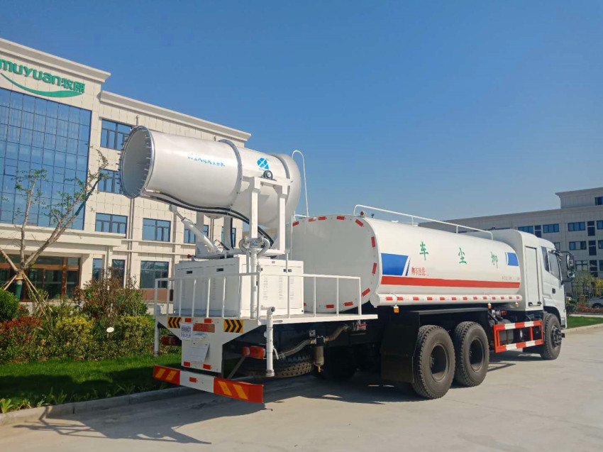 專用裝置為抑塵霧炮,用于城市抑塵,整車長度/前懸/軸距/后伸的對應關系為(mm):8870/1440/3950/920,9120/1440/4200/920,9420/1440/4500/920,9620/1;側防護及后下部防護裝置均采用Q235A材質,均采用焊接連接,后下部防護尺寸:120×50(mm),離地面高度500mm.裝備ABS,型號/生產廠家:3631010-C2000/東科克諾爾商用車制動系統(十堰)有限公司,ABS-E 4S/4M/威伯科汽車控制系統(中國)有限公司.當抑塵距離為60米及80米抑塵霧炮時,后伸為720mm,當抑塵距離為80米和100米抑塵霧炮時,后伸為920mm.隨底盤選裝駕駛室.選裝不帶顆粒捕捉器圖片.