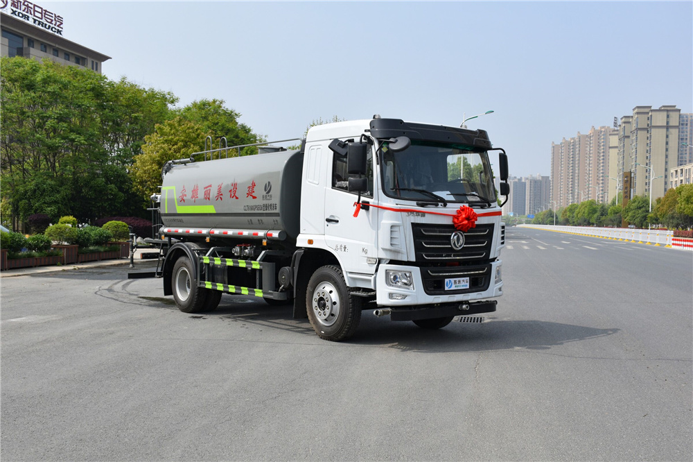 灑水車專用功能配置:罐體實際容積約為12立方米,(罐體有效參數(shù)9.79立方米、額定載質量9325kg、)采用武鋼優(yōu)質碳鋼板卷壓成型。配備專用灑水泵,自吸自排,前噴后灑、側噴、后工作平臺及灑水高壓炮。灑水泵自吸高度為6米左右,整車灑水寬度14米左右,后工作平臺水炮可調成:直沖狀、大雨、中雨、小雨、毛毛雨,有效射程≥28米,整車帶接頭、水位計,自流閥。后工作平臺主管路帶1寸澆花接口,附送2根3米水管,1個爬梯,兩側及后保險杠。