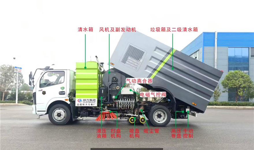 東風8方洗掃車采用東風型國五二類底盤改裝,加裝副發動機、風機、高壓水泵、清水箱、垃圾箱、左右立掃、帶噴水桿的寬吸嘴、低壓沖洗系統、垃圾箱自潔,掃盤降塵系統,液壓系統、專用裝置電控系統和副車架等改裝而成: