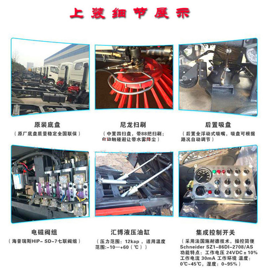 13. 液壓元件采用集成疊加設計,駕駛室電液集中控制,操作方便。駕駛室手動按鈕式液壓系統驅動左右立掃升降、左右掃肋旋轉、吸嘴升降、垃圾箱后門開閉、垃圾箱傾翻復位等機械動作。