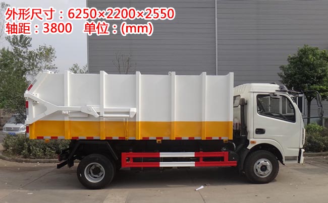 容積7~8立方米,方形密封式箱體,材質邊三底四,國產油泵、多路閥、取力器、液壓油缸,駕駛室外部操作,箱體底部雙杠液壓舉升卸料,箱體后門液壓開啟。