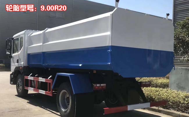 東風多利卡D9掛桶式垃圾車,采用東風襄陽股份多利卡D9底盤,排半駕駛室,康明斯180馬力發動機,東風6檔變速箱,軸距3950,前橋3.9噸,后橋8噸,250車架,9.00R20鋼絲胎。