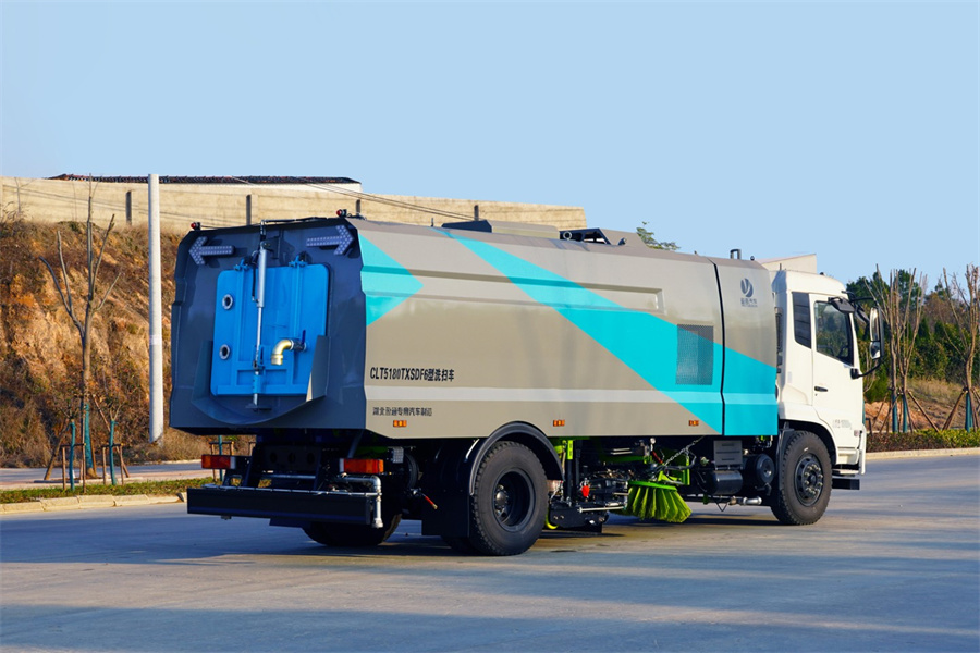 部分車型采用中置四掃刷、吸口后置的布置方式,使得整車結構布置簡捷,清掃效果良好。例如程力掃路車就采用這種布局方式,其垃圾箱及水箱全部采用超厚不銹鋼材料制作,垃圾箱與水箱為整體結構,水箱在垃圾箱的底層使垃圾箱底板預傾角高達12°以上,便于垃圾傾倒干凈。