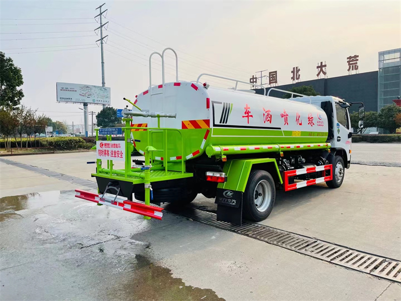 整車帶一個專用灑水泵(垂直最大吸程6米),灑水寬度14米,射程28米。多功能灑水車配備2個前沖(噴)(能將路面泥巴、塵土、垃圾沖干凈);2個后灑(能均勻地將水灑在路面,一次灑水寬度14米)、2個側噴(花灑)(能均勻地將路旁綠化帶澆灌)、帶1個后工作平臺,平臺上安裝1個綠化灑水高炮(灑水炮可全方位旋轉,可連續調成直沖狀、大雨、小雨、毛毛雨,霧狀可調節沖洗高大樹木),引水時間<5min,流量90m3/h。帶1個消防接頭,帶1個自流閥,1個過濾裝置、人性化爬梯及側防護欄,安裝灑水音樂喇叭