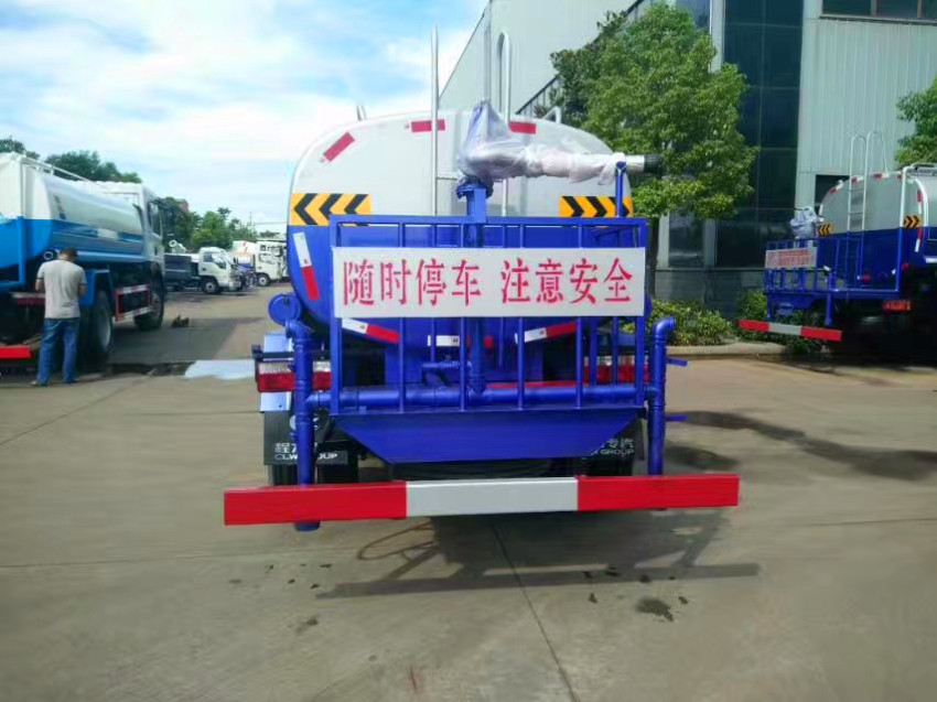 改裝配置:罐體用4MM碳鋼板制作,罐內隔板具有防波作用,以減低汽車行駛時罐體液體的沖擊。整車帶一個專用灑水泵(垂直最大吸程6米),灑水寬度14米,射程28米。多功能灑水車配備2個前沖(噴)(能將路面泥巴、塵土、垃圾沖干凈);2個后灑(能均勻地將水灑在路面,一次灑水寬度14米)、2個側噴(花灑)(能均勻地將路旁綠化帶澆灌)、帶1個后工作平臺,平臺上安裝1個綠化灑水高炮(灑水炮可全方位旋轉,可連續調成直沖狀、大雨、小雨、毛毛雨,霧狀可調節沖洗高大樹木),引水時間<5min,流量90m3/h。帶1個消防接頭,帶1個自流閥,1個過濾裝置、人性化爬梯及側防護欄,安裝灑水音樂喇叭。