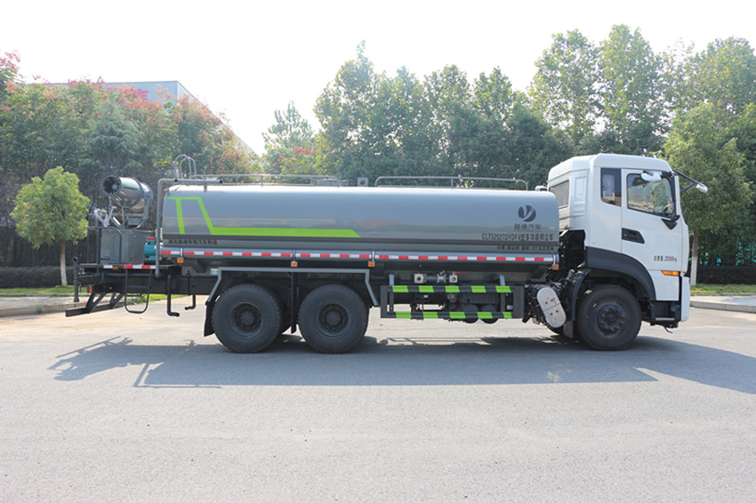 ABS型號:3631010-C2000,ABS 8,4460046450;ABS生產企業:東科克諾爾商用車制動系統(十堰)有限公司,東科克諾爾商用車制動系統(十堰)有限公司,威伯科汽車控制系統(中國)有限公司;選裝描述:隨底盤選裝駕駛室,選裝附件布局;側后防護情況:側、后防護材料均為:Q235碳鋼,連接方式均為:螺栓連接,后部防護截面尺寸(mm):120×50,后部防護離地高度(mm):480;罐體有效容積(立方米)、罐體外形尺寸(mm):罐體有效容積:14.7立方米;罐體外形尺寸(長×長軸×短軸)(mm):6500×2360×1400;專用功能及裝置:該車主要用于城鄉園林綠化,路面噴灑,除塵和降溫;主要裝置為水罐及噴灑裝置;