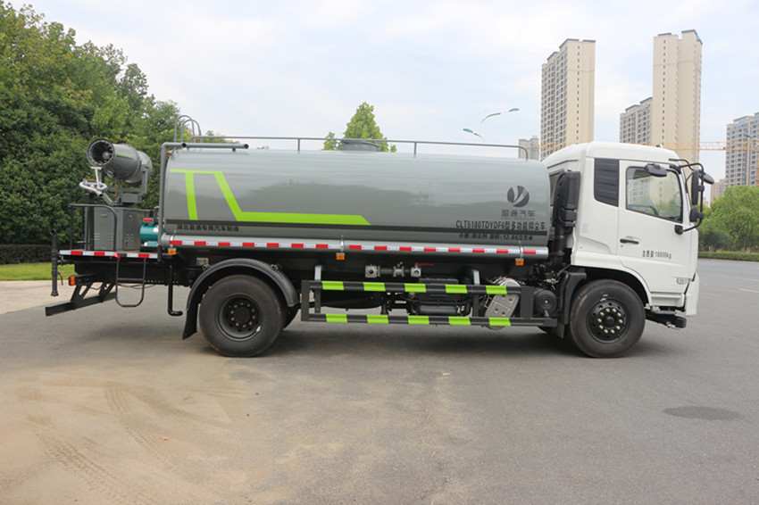 我公司產(chǎn)品標(biāo)配前沖后灑、側(cè)噴、后置式工作平臺(tái)、平臺(tái)上有高壓水炮(可360°旋轉(zhuǎn),可調(diào)成柱狀最大射程35米,也可調(diào)成霧狀最大射程15米,可調(diào)成:直沖狀、大雨、中雨、小雨、毛毛雨),配備優(yōu)質(zhì)大功率專用灑水泵,取力器,雜物過濾網(wǎng),國標(biāo)通用65型消防接口(可通過消防栓加水)、1套自流球閥系統(tǒng)(可自吸自排,可從河里或池塘抽水到罐體,最大吸程7米),2根引水鋼絲膠管。水泵、取力器、球閥、濾網(wǎng)均為國家標(biāo)準(zhǔn)產(chǎn)品,主管道加粗,法蘭墊、法蘭盤加厚,萬向前沖,大通徑球閥,具有性能優(yōu)良,工作可靠、效率高、流量大、維修方便等特點(diǎn)。