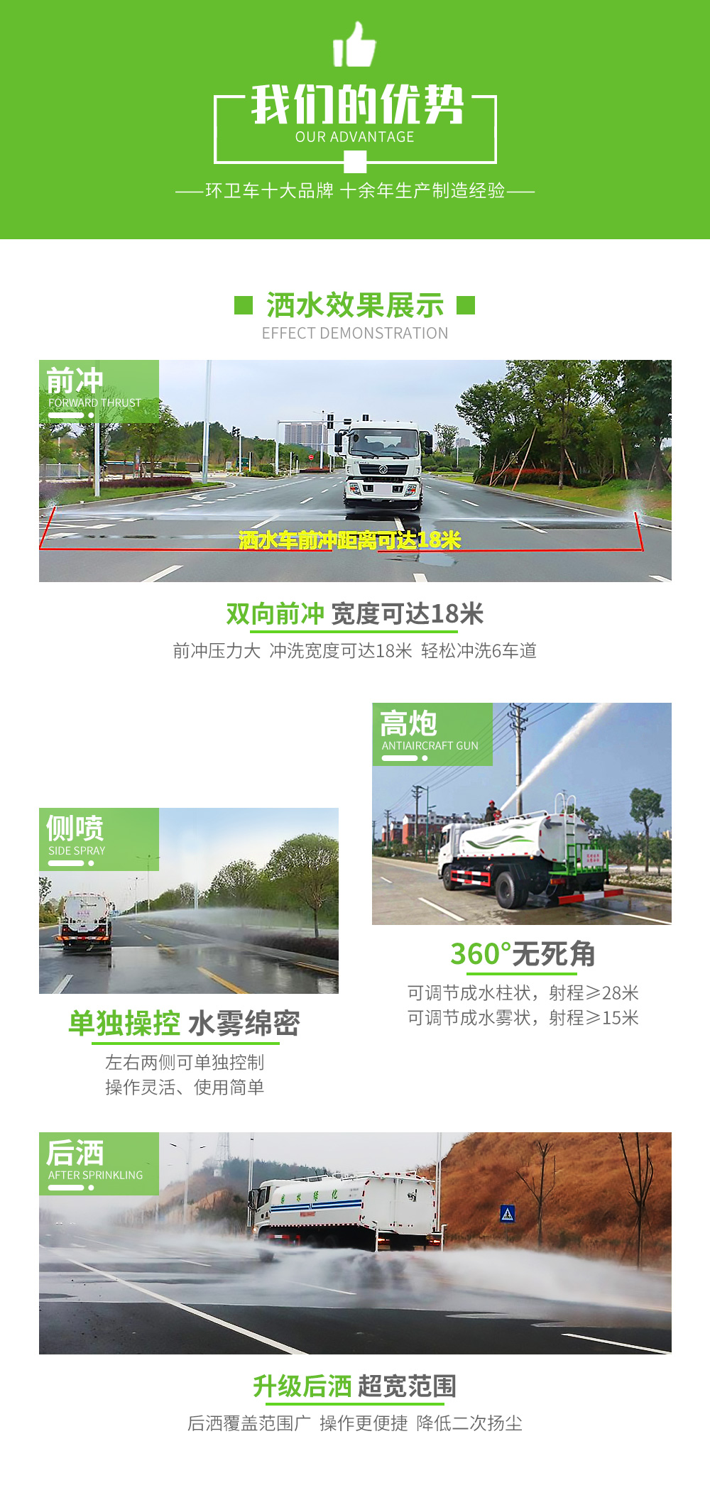 用功能配置:罐體實際容積約為22立方米(罐體有效參數17.6立方米、額定載質量13405kg、)采用武鋼優質碳鋼板卷壓成型。配備專用灑水泵,自吸自排,前噴后灑、側噴、后工作平臺及灑水高壓炮。灑水泵自吸高度為6米左右,整車灑水寬度14米左右,后工作平臺水炮可調成:直沖狀、大雨、中雨、小雨、毛毛雨,有效射程≥28米,整車帶接頭、水位計,自流閥。后工作平臺主管路帶1寸澆花接口,附送2根3米水管,1個爬梯,兩側及后保險杠。