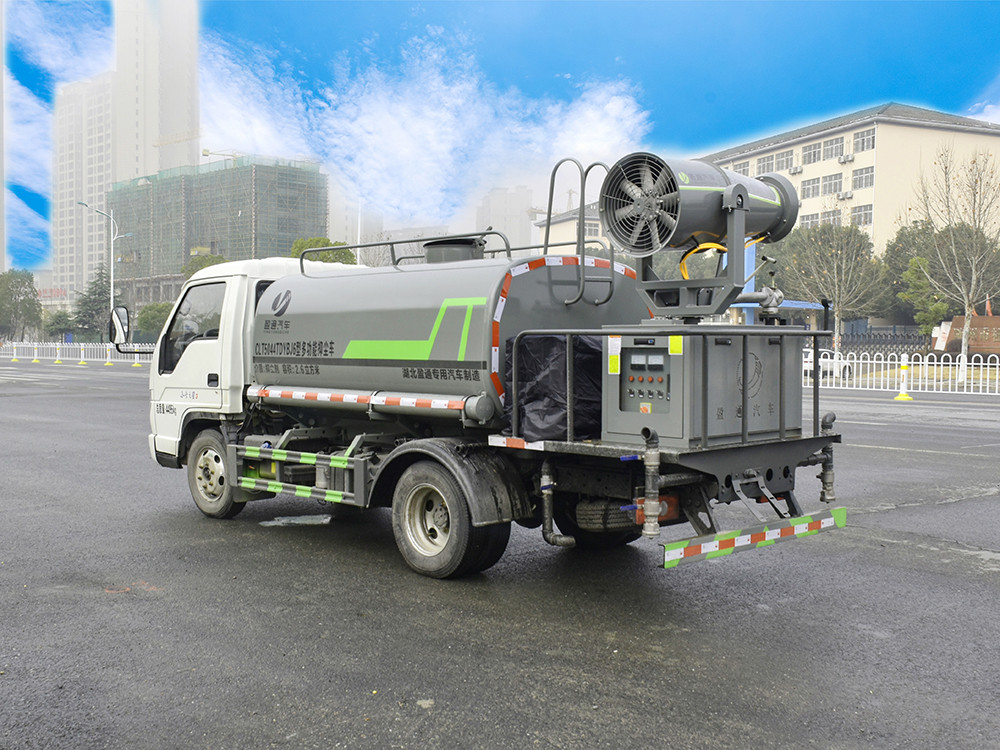 福田小卡 3 4.1 方藍牌抑塵車產品簡述 抑塵車又稱為綠化噴灑車、多功能灑水車、園林綠化灑水車。抑 塵車適合于各種路面沖洗,樹木、綠化帶、草坪綠化,道路、廠礦企業 施工建設,高空建筑沖洗。抑塵也可以作為運水車使用,最常見的車 型有綠化噴灑車、多功能灑水車、綠化灑水車幾大類。 我公司產品標配后對沖、后灑、側噴、后置式工作平臺,平臺上 配置綠化水炮(可 360°旋轉,既可以調成柱狀,也可以調成霧狀, 更可以調成直沖狀、大雨、中雨、小雨、毛毛雨),配備優質大功率 專用灑水泵(可自吸自排,可從河里或池塘抽水到罐體),取力器, 雜物過濾網,消防接口,自流球閥系統、取力器、球閥、濾網均為國家 標準產品,主管道加粗,法蘭墊、法蘭盤加厚,大通徑球閥。整體具 備性能優良安全可靠、效率高、流量大、維修方便等特點。